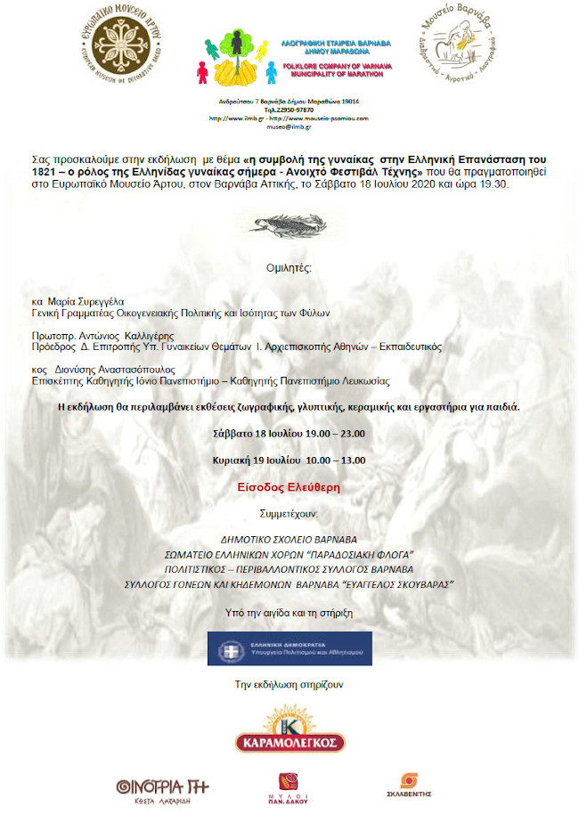 «Η συμβολή της γυναίκας στην Ελληνική Επανάσταση του 1821 και ο ρόλος της Ελληνίδας γυναίκας σήμερα – Ανοιχτό Φεστιβάλ Τέχνης» αποτελεί το θέμα της διήμερης εκδήλωσης του Ευρωπαϊκού μουσείου Άρτου στον Βαρνάβα Αττικής στις 18 και 19 Ιουλίου 2020.