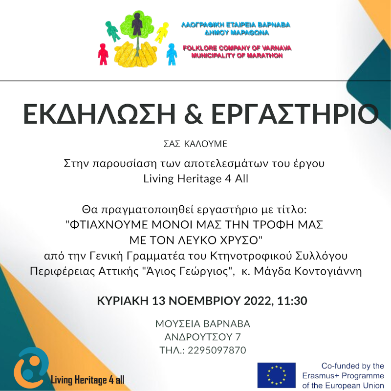 Σας προσκαλούμε στην εκδήλωση – εργαστήριο της Λαογραφικής Εταιρείας Βαρνάβα Δήμου Μαραθώνα την Κυριακή 13 Νοεμβρίου 2022, στις 11 το πρωί, στα Μουσεία Βαρνάβα, οδός Ανδρούτσου 7.