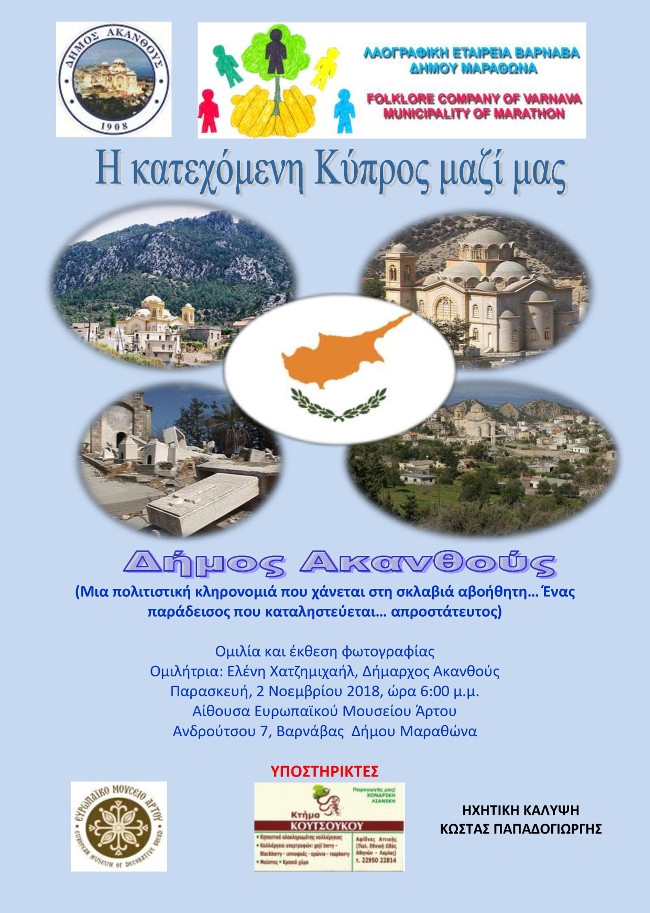 Το θέμα της εκδήλωσης «Μια πολιτιστική κληρονομιά που χάνεται στη σκλαβιά αβοήθητη…. Ένας παράδεισος που καταληστεύεται … απροστάτευτος», έχει σκοπό και στόχο την ενημέρωση και ευαισθητοποίηση όλων, για τη συνεχιζόμενη καταστροφή κι αλλοίωση της ελληνικής θρησκευτικής ταυτότητας και κληρονομιάς της Ακανθούς στην κατεχόμενη Κύπρο. Μέρος των φωτογραφιών της εκδήλωσης, αναφέρονται στις συνθήκες της βίαιης εγκατάλειψης της κωμόπολης το 1974, κατά τη διάρκεια της τουρκικής εισβολής. Ομιλήτρια της εκδήλωσης, η κα. Ελένη Χατζημιχαήλ, δήμαρχος Ακανθούς.